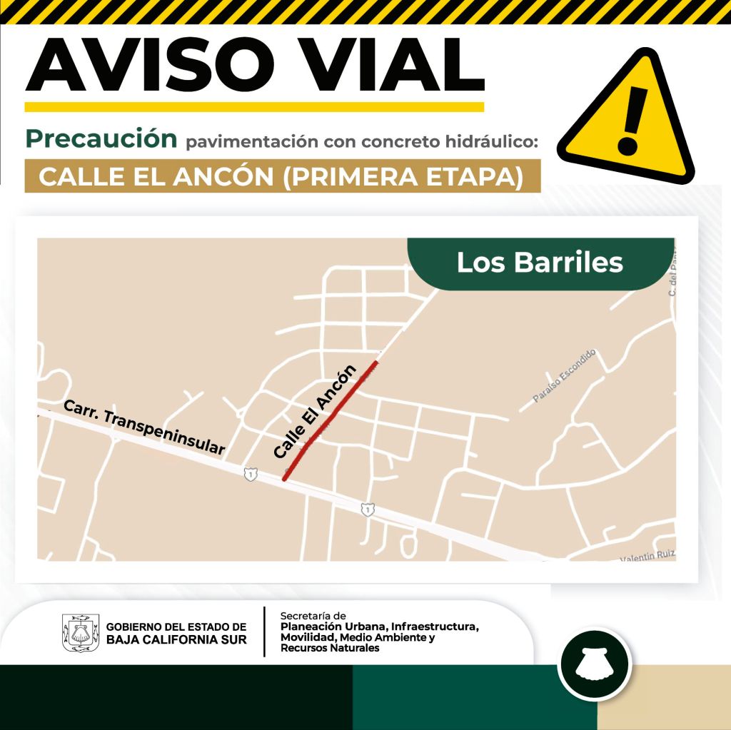 La Paz, #BCS. a 09 de mayo de 2024.- El Gobierno del Estado de Baja California Sur, a través de la Secretaría de Planeación Urbana, Infraestructura, Movilidad, Medio Ambiente y Recursos Naturales (SEPUIMM), informa a la ciudadanía de la comunidad de Los Barriles, sobre el inicio de la obra de pavimentación en concreto hidráulico de la calle El Ancón (Primera Etapa), en el municipio de La Paz.