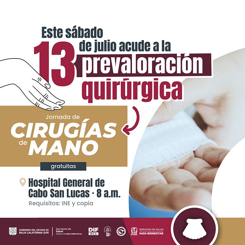 Cabo San Lucas, Baja California Sur, a 12 de julio de 2024.- El Gobierno del Estado, a través de la Secretaría de Salud, desarrollará este sábado jornada pre quirúrgica de manos en el Hospital General de Cabo San Lucas, como resultado de los esfuerzos que suma con una agrupación nacional de médicos especialistas, con el objetivo de mejorar las condiciones de bienestar de sudcalifornianas y sudcalifornianos con ese tipo de problema.