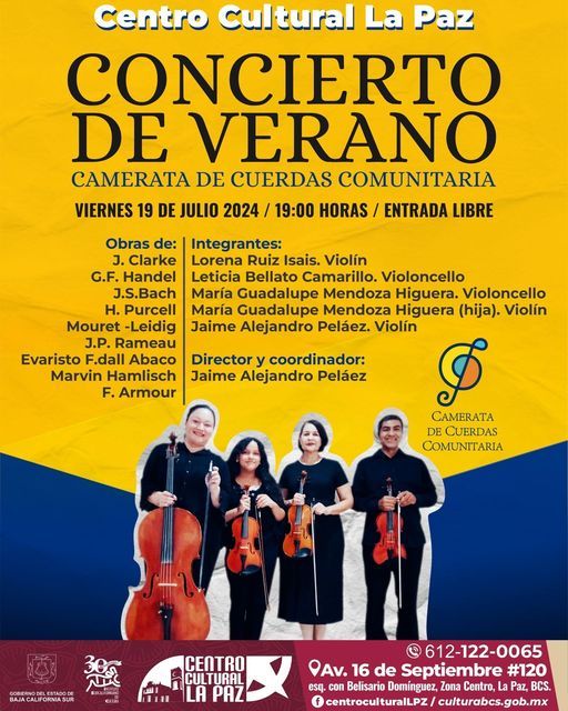 El Centro Cultural La Paz (CCLPZ) invita al público aficionado de la música y la cultura al Concierto de Verano. El evento se llevará a cabo este viernes 19 de julio a las 19:00 horas y contará con la participación estelar de la Camerata de Cuerdas Comunitaria, un ensamble formado por talentosos músicos de la región que se han unido para brindar una experiencia musical inolvidable.