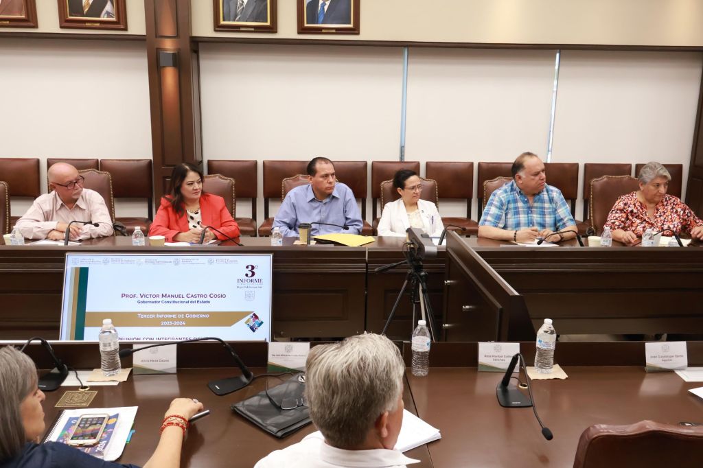 La Paz, Baja California Sur, a 18 de julio de 2024.- Con el propósito de evaluar avances en la integración de lo que será el III Informe de la presente administración y dar seguimiento a la conformación del documento que se dará a conocer a las y los sudcalifornianos el próximo mes de noviembre, el gobernador Víctor Manuel Castro Cosío encabezó reunión con integrantes de su gabinete.