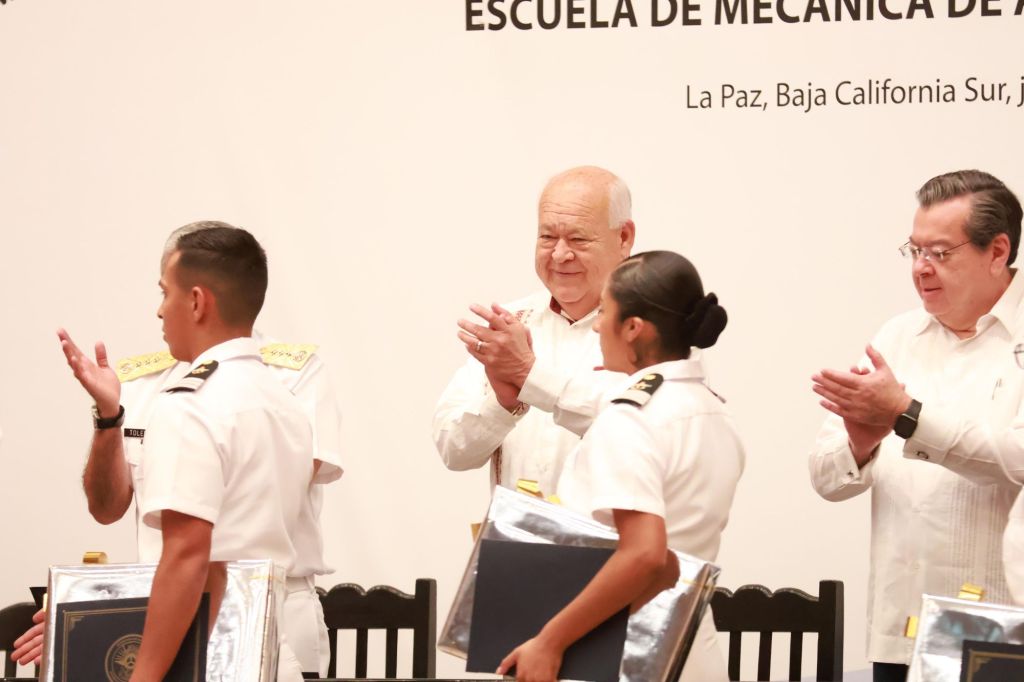 La Paz, Baja California Sur, a 19 de julio de 2024.- El gobernador Víctor Manuel Castro Cosío, en compañía del Almirante Gerardo de Jesús Toledo Guzmán, Comandante de la Cuarta Región Naval, encabezó la ceremonia de graduación e imposición de ala fija y ala móvil a 20 técnicos profesionales en mecánica de aviación naval, generación 2021-2024.