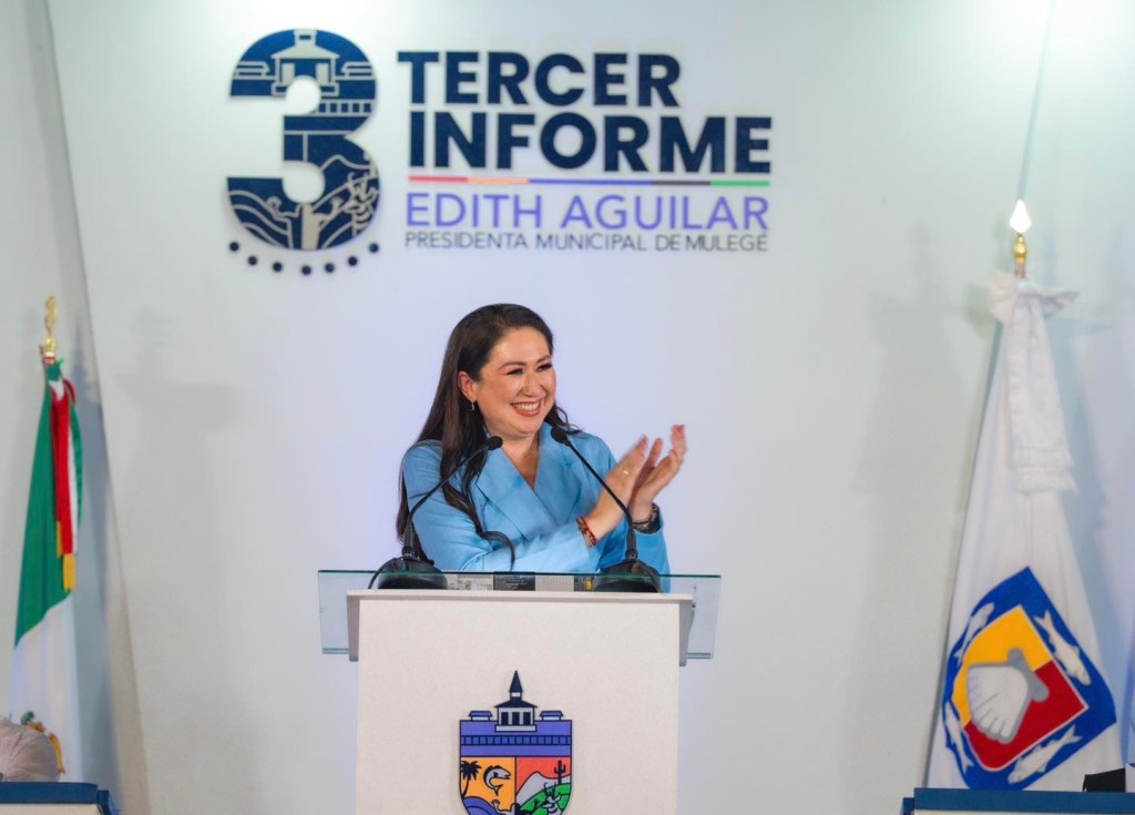 Santa Rosalía, B.C.S.- La alcaldesa de Mulegé, Edith Aguilar Villavicencio rindió su tercer informe de gobierno en el marco de una sesión solemne realizada en la Plaza Pública Benito Juárez de Santa Rosalía.