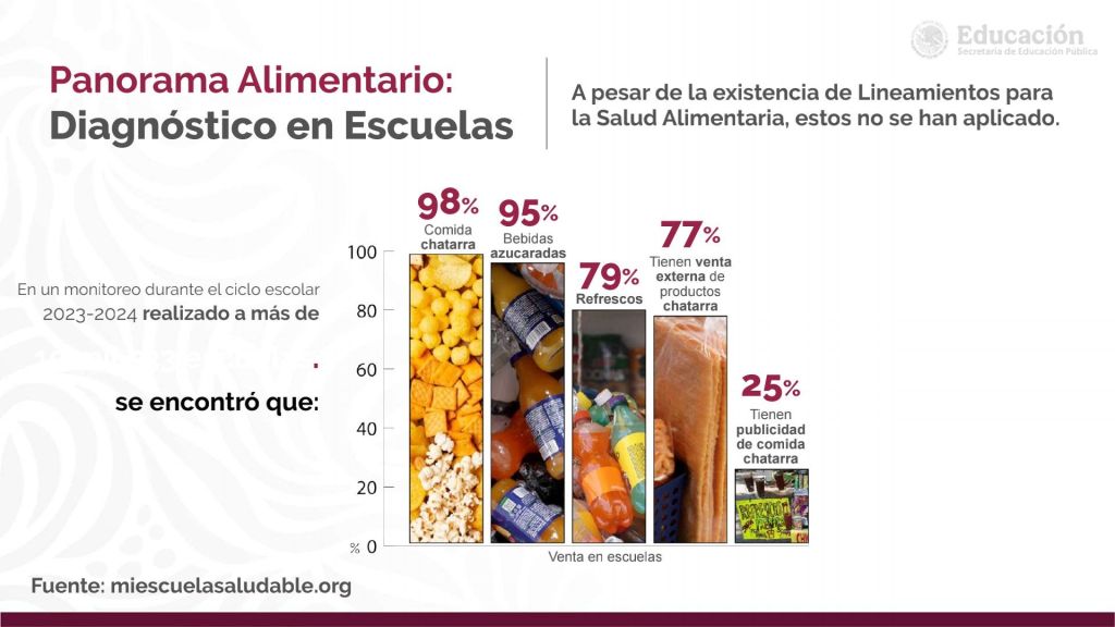 Manifestó que la necesidad de reforzar esta estrategia se debe a que, aunque ya existen lineamientos para promover una alimentación saludable, éstos no suelen cumplirse, prueba de ello son los resultados del monitoreo realizado en el ciclo escolar 2023-2024 98 por ciento de las escuelas mantiene la venta de comida chatarra: 95 por ciento de bebidas azucaradas: 79 por ciento, refrescos: 77 por ciento registra venta externa de comida chatarra y 25 por ciento tiene publicidad de estos productos.