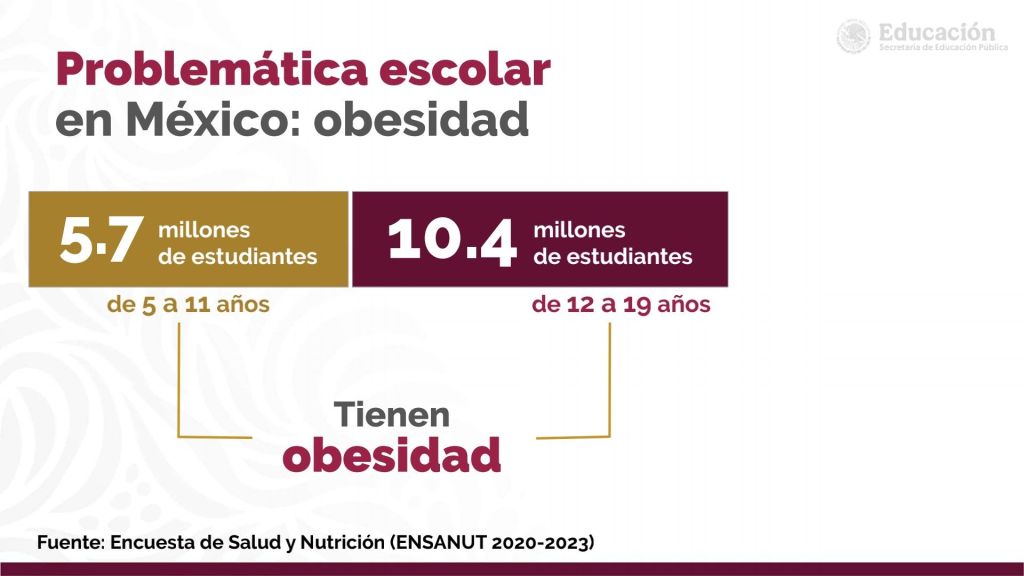 Destacó que la última Encuesta Nacional de Salud y Nutrición (Ensanut) 2020- 2023), informó que 5.7 millones de estudiantes de 5 a 11 años presentan obesidad. lo mismo que 10.4 millones de 12 a 19 años.