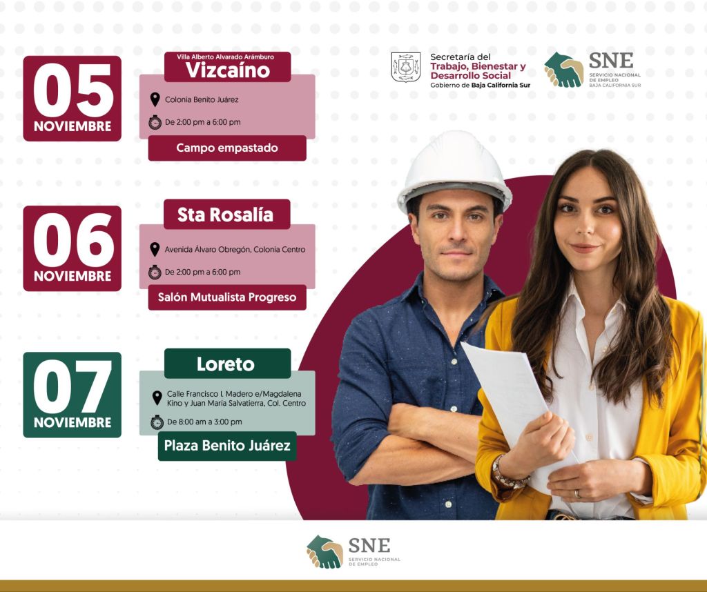 Mulegé, Baja California Sur, a 3 de noviembre de 2024.- La Secretaría del Trabajo, Bienestar y Desarrollo Social (STByDS) a través del Servicio Nacional de Empleo de Baja California Sur (SNE-BCS) anunció que los días cinco, seis y siete de noviembre se estarán realizando jornadas de empleo al norte de la entidad, en el marco de la estrategia “La Chamba Nos Une”, que busca acercar opciones de empleo a las y los ciudadanos.