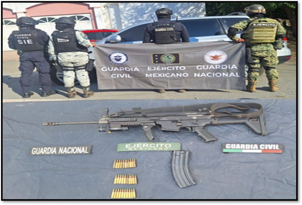 -En el municipio de Concordia, elementos del Ejército Mexicano, detuvieron a cuatro sujetos, a quienes se les aseguraron cinco armas largas, 35 cargadores, 770 cartuchos, dos chalecos tácticos y dos chalecos balísticos.