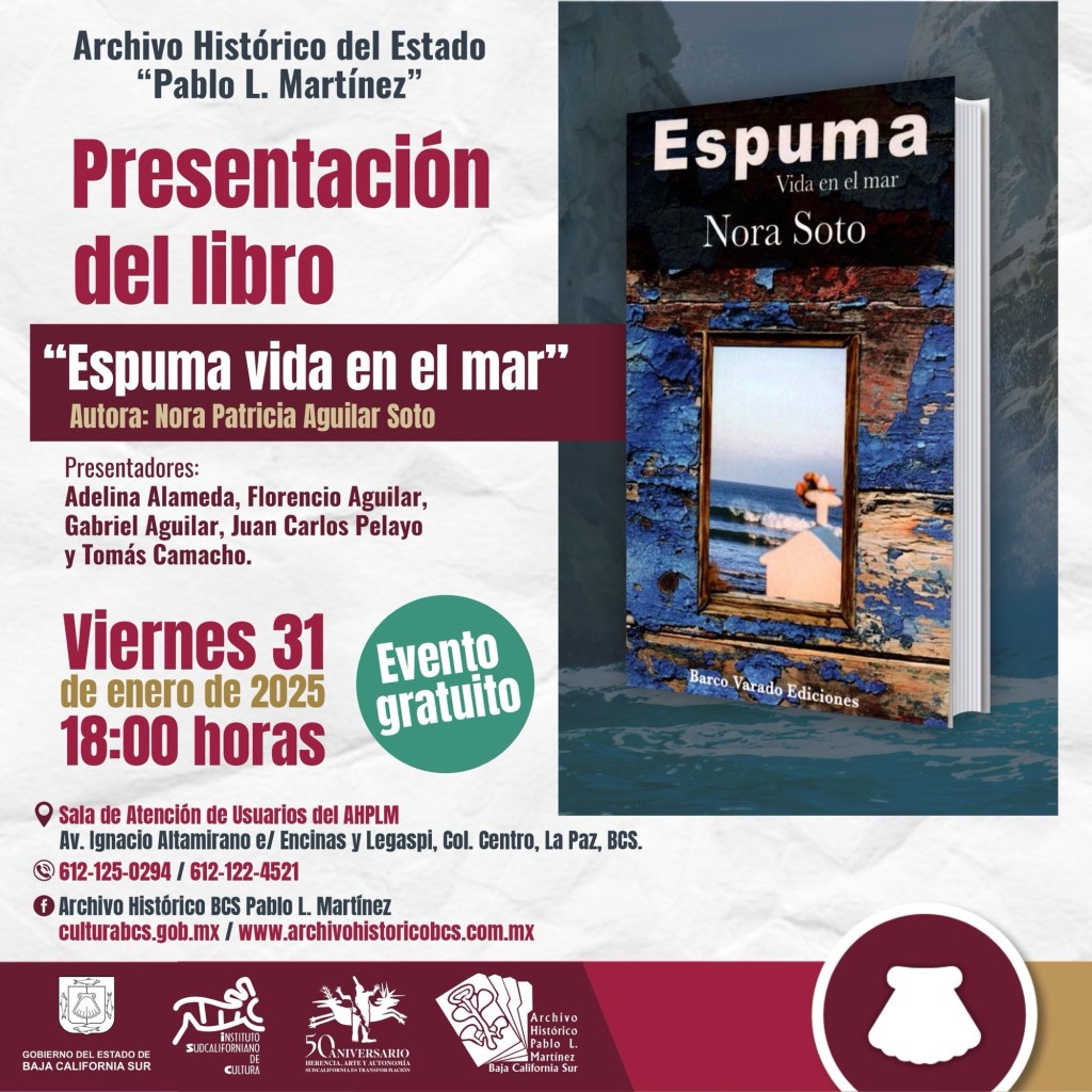La Paz, Baja California Sur, a 31 de enerode 2025.- El Gobierno del Estado, a través del Instituto Sudcaliforniano de Cultura (ISC) invita a laciudadanía a la presentación del más reciente libro de la escritora Nora Soto, «Espuma vida en el mar».