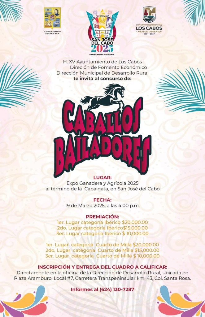 Los Cabos, Baja California Sur.- El XV Ayuntamiento de Los Cabos, a través de la Dirección de Fomento Económico y la Dirección de Desarrollo Rural extiende una invitación a participar en el concurso de “Caballos Bailadores” que se realizará en el marco de las Fiestas Tradicionales San José del Cabo 2025.