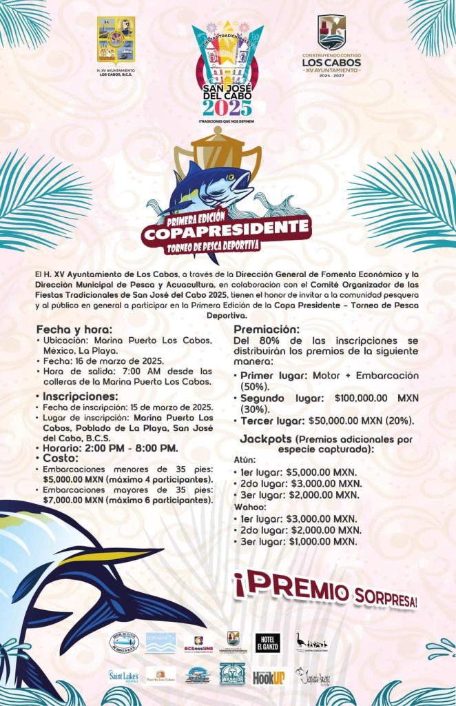 Los Cabos, Baja California Sur.- El XV Ayuntamiento de Los Cabos, a través de la Dirección Municipal de Pesca y Acuacultura y la Dirección General de Fomento Económico invita a participar en la primera edición del Torneo de Pesca Deportiva “Copa Presidente”, que se realizará en el marco de las Fiestas Tradicionales San José del Cabo 2025.