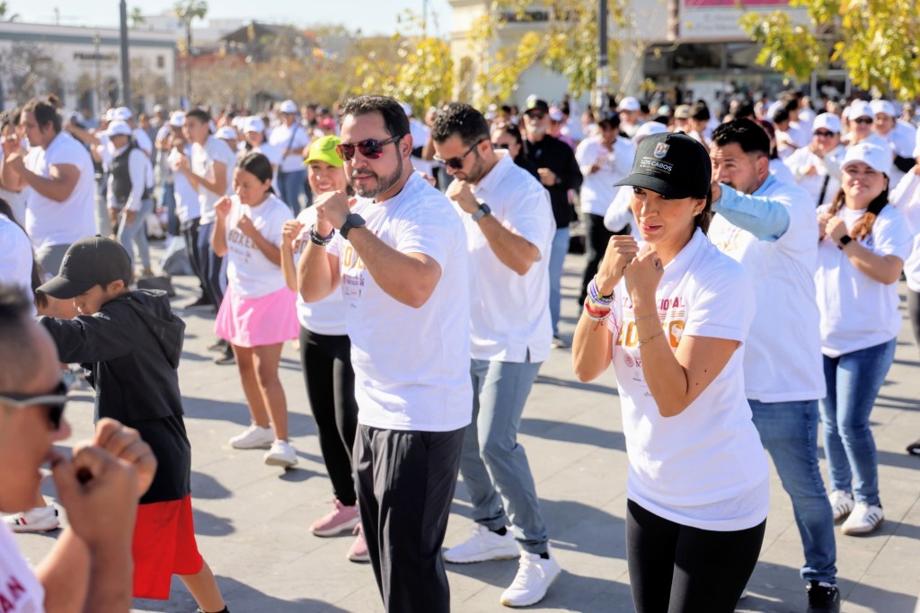 Los Cabos, Baja California Sur.- El alcalde de Los Cabos, arquitecto Christian Agúndez Gómez, acompañado de la presidenta honoraria del DIF, Sol Delgado, así como servidores públicos de las diversas áreas del XV Ayuntamiento de Los Cabos participaron en la Clase Nacional de Box, un evento promovido por el Gobierno de México.