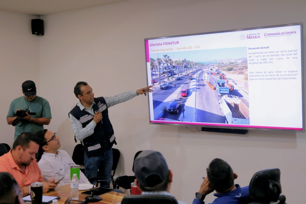 Los Cabos, Baja California Sur, la 23 de mayo de 2025.- Con el compromiso de la Secretaría de Infraestructura, Comunicaciones y Transporte (SICyT) de informar aportunamente a la ciudadanía, el presidente municipal de Los Cabos, arquitecto Christian Agúndez Gómez encabezó la Mesa Técnica de Movilidad, en la que se establecieron acuerdos dirigidos al desfogue del tránsito vehicular en el tramo donde se realizan las obras de construcción del paso a desnivel en la glorieta de Fonatur, en San José del Cabo.