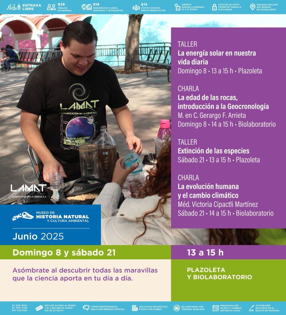 Y si quieres asombrarte con las maravillas que la ciencia aporta en tu día a día, no te pierdas el taller “La energía solar en nuestra vida diaria”, en la plazoleta del museo de 13:00 a 15:00 horas, y la charla “La edad de las rocas, introducción a la Geocronología”, en el biolaboratorio de 14:00 a 15:00 horas. Ambas actividades están a cargo del colectivo LAMAT, son el 8 de junio y están incluidas en tu boleto de entrada al museo.