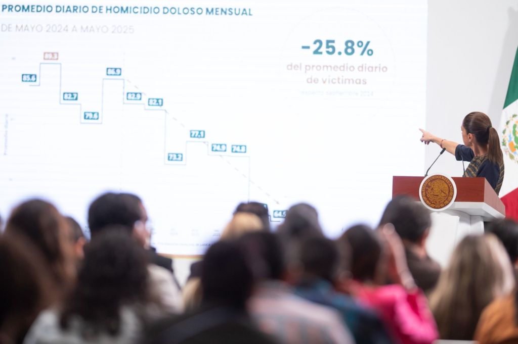 La Presidenta de México Claudia Sheinbaum Pardo resaltó que, gracias al trabajo del Gabinete de Seguridad y a que funciona la Estrategia Nacional de Seguridad, el homicidio doloso disminuyó en 25.8 por ciento, de septiembre de 2024 a mayo de 2025, lo que significa 22 homicidios diarios menos que en septiembre del año pasado.