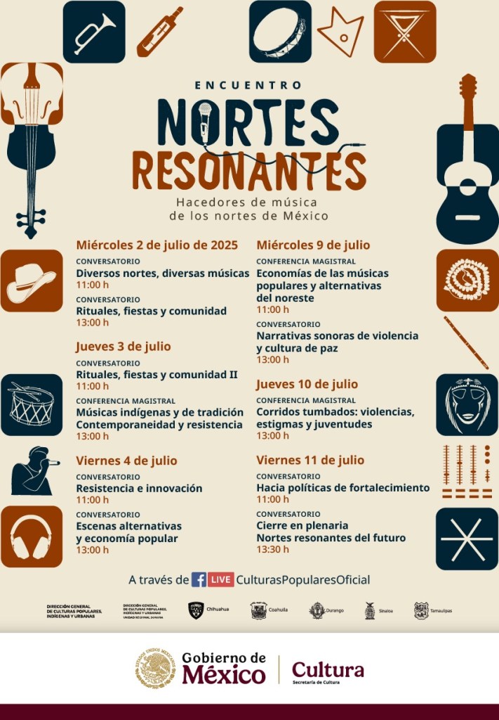 Como parte de las acciones estratégicas de la Secretaría de Cultura del Gobierno de México, a través de su Dirección General de Culturas Populares, Indígenas y Urbanas (DGCPIU), para promover y difundir la diversidad cultural y la música, se llevará a cabo el encuentro virtual “Nortes Resonantes. Hacedores de música de los nortes de México”.