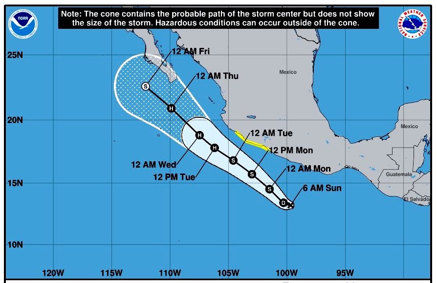 Actualmente, se localiza a aproximadamente 370 km al sur de Acapulco, Guerrero a 750 km al sureste de Manzanillo, Colima, con desplazamiento hacia el oeste (285°) a una velocidad de 15 km/h.
