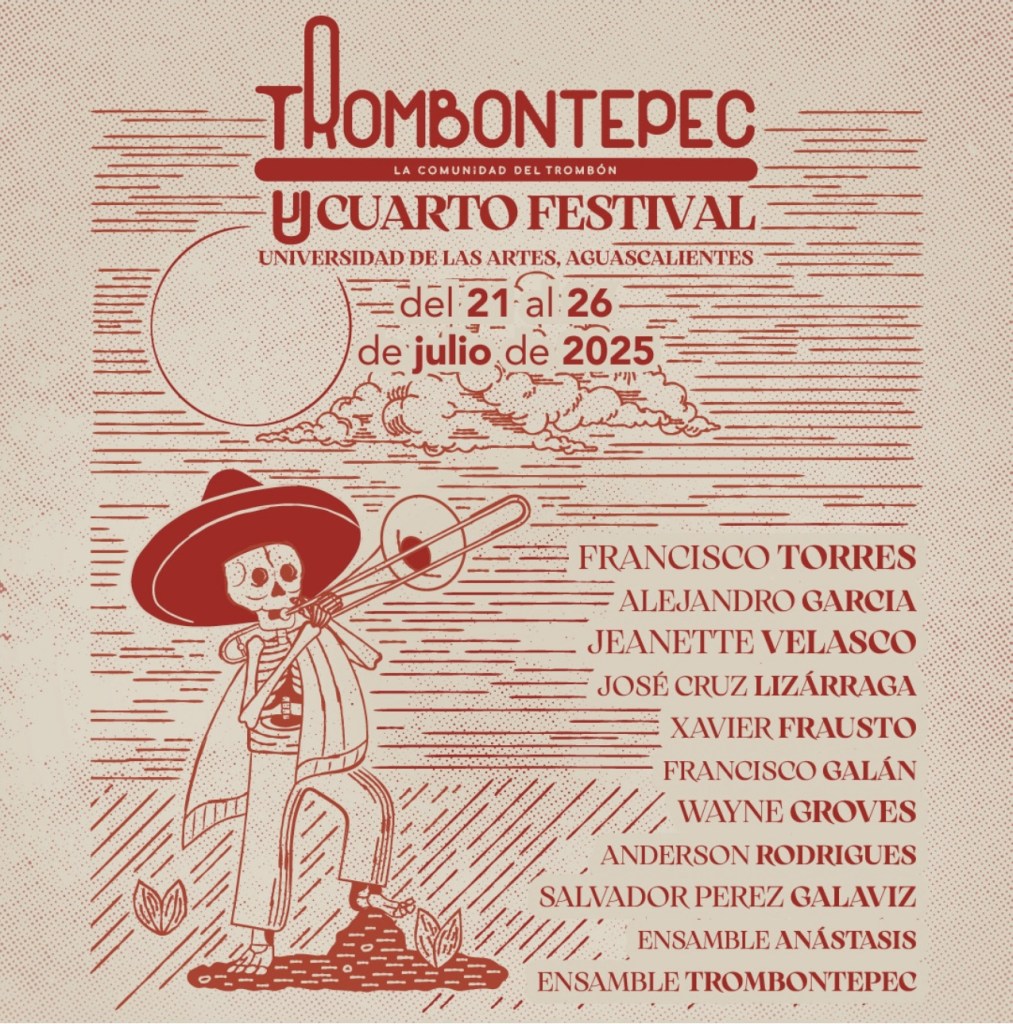 Del 21 al 26 de julio de 2025, la Universidad de las Artes del Instituto Cultural de Aguascalientes será la sede del Cuarto Festival Trombontepec, que, en la presente edición contará con la participación de 18 maestros trombonistas y la música de banda sinaloense como invitada especial.