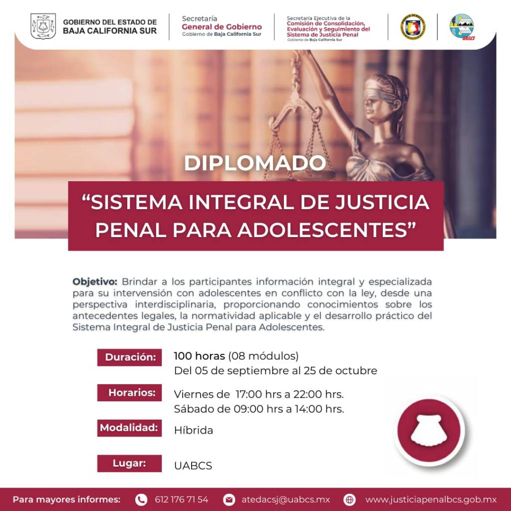 La Paz, Baja California Sur, a 17 de agosto de 2025.- Con el objetivo de fortalecer las competencias de las personas operadoras y autoridades del Sistema de Justicia Penal para Adolescentes, el Gobierno del Estado y la Secretaría General de Gobierno, a través de la Secretaría Ejecutiva de la Comisión de Consolidación del Sistema de Justicia Penal (CCSJP), en coordinación con la Universidad Autónoma de Baja California Sur (UABCS) y el Poder Judicial, llevará a cabo el Diplomado en Sistema Integral de Justicia Penal para Adolescentes.