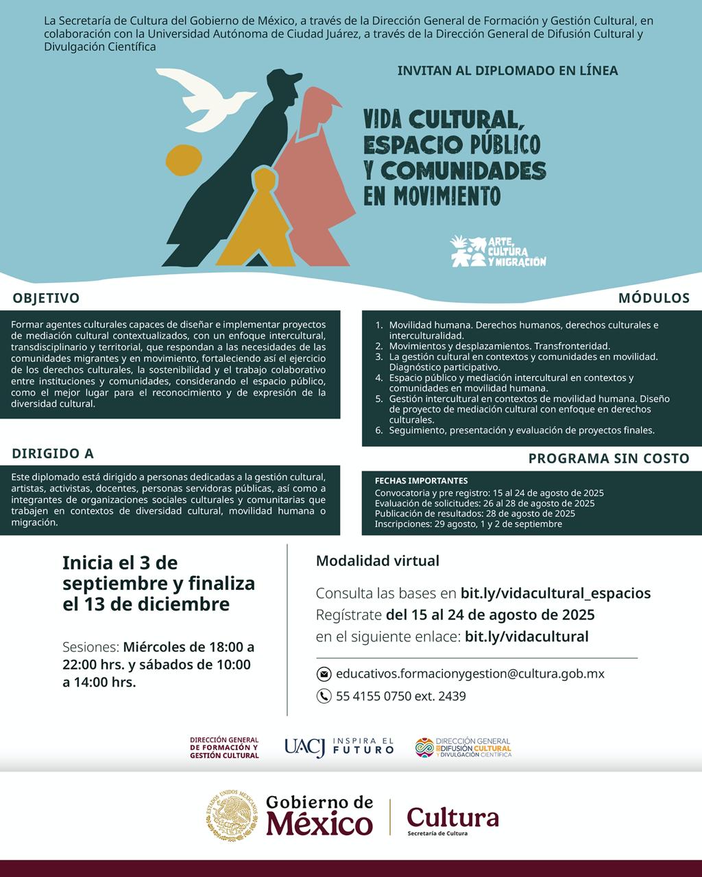 La Secretaría de Cultura del Gobierno de México, a través de la Dirección General de Formación y Gestión Cultural, y la Universidad Autónoma de Ciudad Juárez (UACJ), a través de la Dirección General de Difusión Cultural y Divulgación Científica, anuncian la apertura de la convocatoria al diplomado “Vida cultural, espacio público y comunidades en movimiento”.