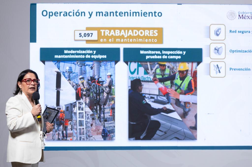 Además, puntualizó que 5 mil 97 trabajadores están destinados a la operación y mantenimiento de la Red Nacional de Transmisión para optimizar los recursos y garantizar que sea una red segura, confiable y moderna. Aunado a que se implementan innovaciones como la Red Eléctrica Inteligente (REI) que consiste en monitoreo y control a distancia, ajuste remoto del flujo eléctrico, conforme la demanda y comunicación a través de fibra óptica, asimismo se renueva infraestructura existente desde cables de alta temperatura, crucetas aislantes, transformadores digitales, monitoreo de lineas aéreas y subterráneas, mapeo digital 3D y sensores móviles.