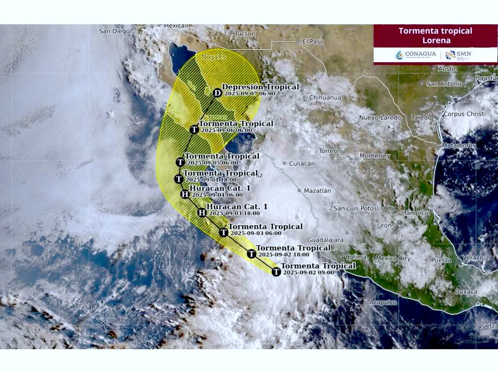 De acuerdo con el pronóstico, durante la medianoche de este martes, “Lorena” se ubicará al sur de las costas de Los Cabos, aproximadamente a 350 kilómetros de distancia.