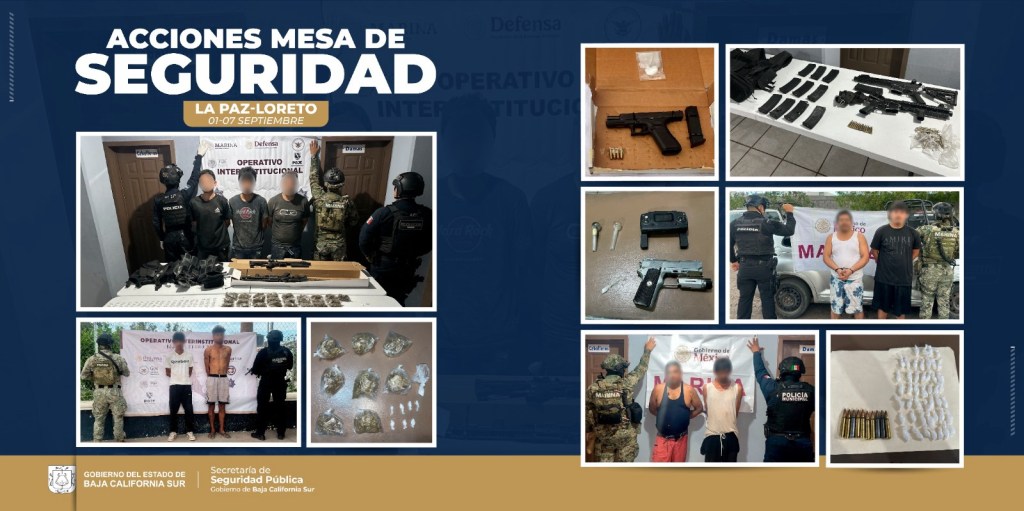 La Paz, Baja California Sur, a 8 de septiembre de 2025.- Como resultado de las acciones operativas realizadas del uno al siete de septiembre, la Mesa Estatal de Seguridad informa que, en el marco de los operativos desplegados en los municipios de La Paz y Loreto para la ubicación de personas generadores de violencia, se logró la detención de 10 personas en posesión de armas y narcóticos, así como de dos personas más por delitos del fuero común.