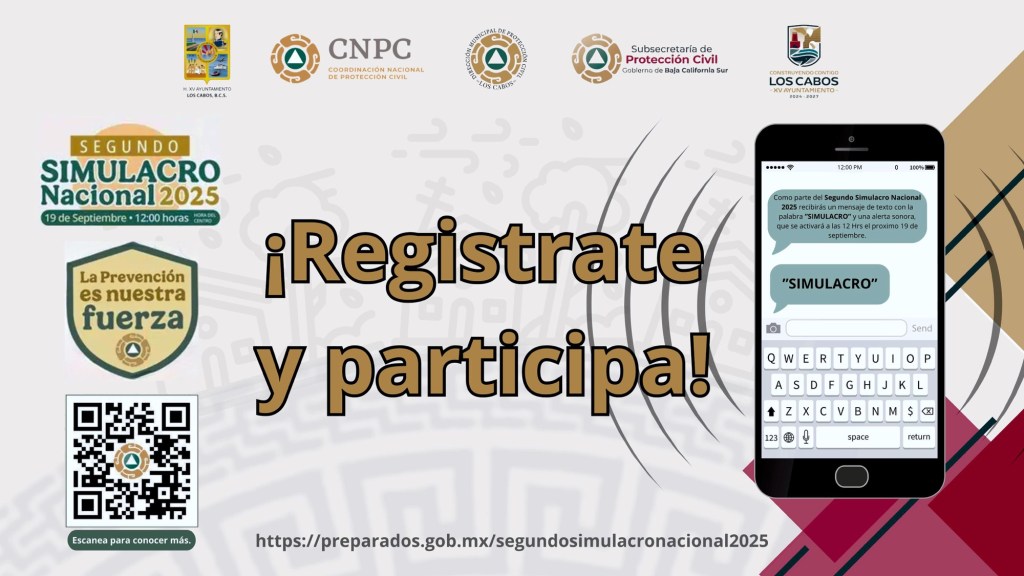 Los Cabos, Baja California Sur. – El XV Ayuntamiento de Los Cabos que preside Christian Agúndez Gómez, a través de la Dirección Municipal de Protección Civil, convoca a la ciudadanía en general y distintos sectores, a participar en el Segundo Simulacro Nacional 2025 que se realizará estepróximo 19 de septiembre.