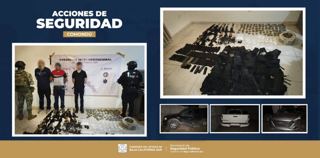 La acción se llevó a cabo en Ciudad Constitución, derivado de un reporte recibido a través del número de emergencias 911, en el que se alertaba de disparos con arma de fuego, por lo que se activó el código rojo y durante el mismo se visualizó a una persona armada, iniciando el protocolo correspondiente que tuvo como resultado, el aseguramiento de 03 personas del sexo masculino, 09 armas de fuego calibre 7.62 y 5.56 mm., 14 cargadores calibre 7.62 mm. y 34 cargadores calibre 5.56 mm.