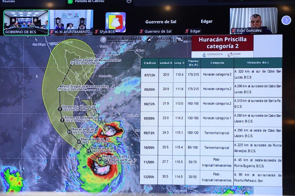 La Paz, Baja California Sur, a 7 de octubre de 2025.- El fenómeno “Priscilla” mantiene su trayectoria hacia el noroeste y, según los reportes del Servicio Meteorológico Nacional, no se prevé un impacto directo a Baja California Sur. Sin embargo, sus bandas nubosas podrán ocasionar lluvias intensas en distintas zonas del estado, señaló el gobernador Víctor Manuel Castro Cosío, al reiterar el llamado a la población a permanecer atenta a los avisos oficiales.