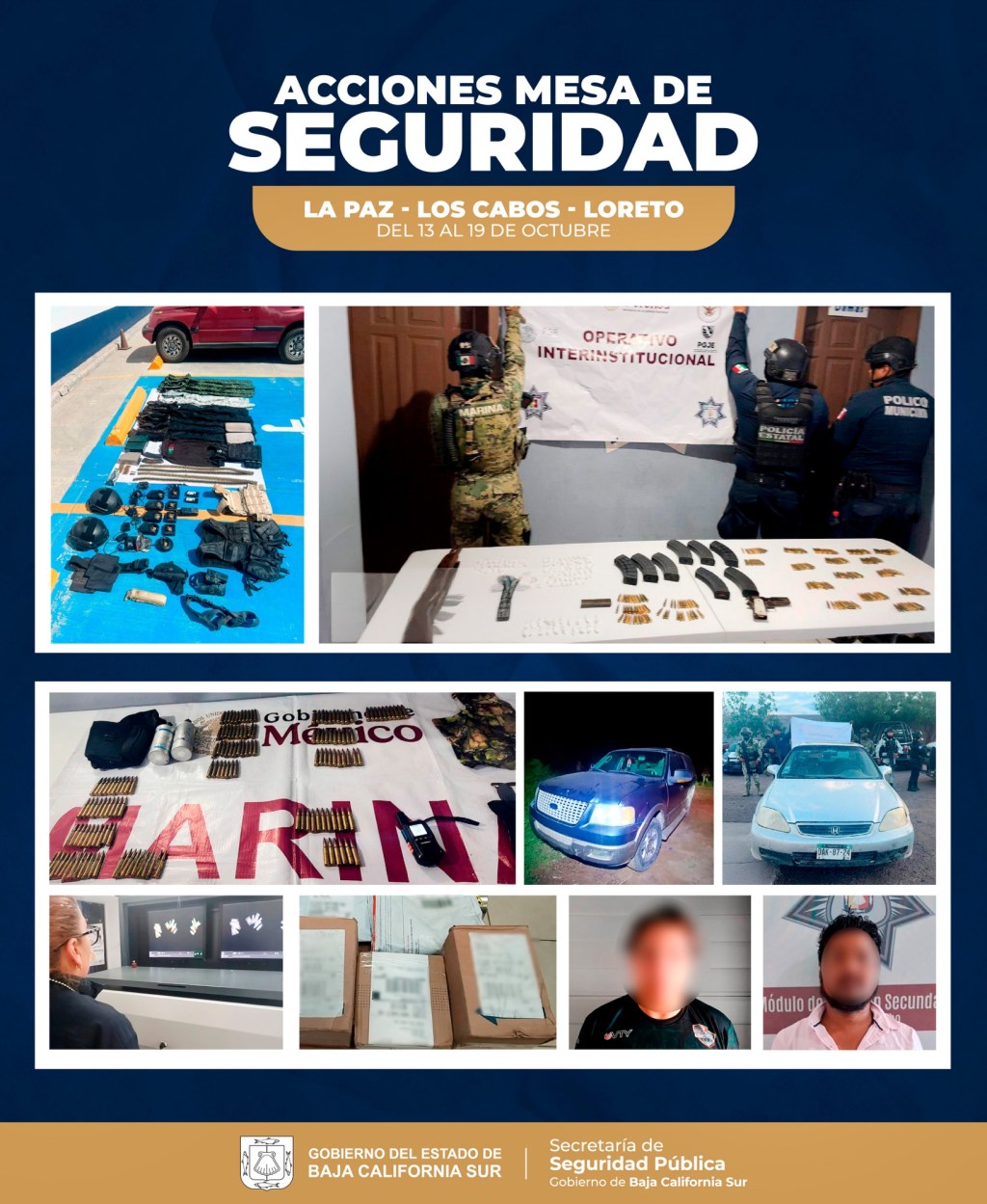 La Paz, Baja California Sur, a 20 de octubre de 2025.- En el marco de las acciones coordinadas que realiza la Mesa Estatal de Seguridad para mantener el orden y la paz en Baja California Sur, informa los resultados obtenidos durante la semana del 13 al 19 de octubre en los municipios de La Paz, Los Cabos y Loreto.