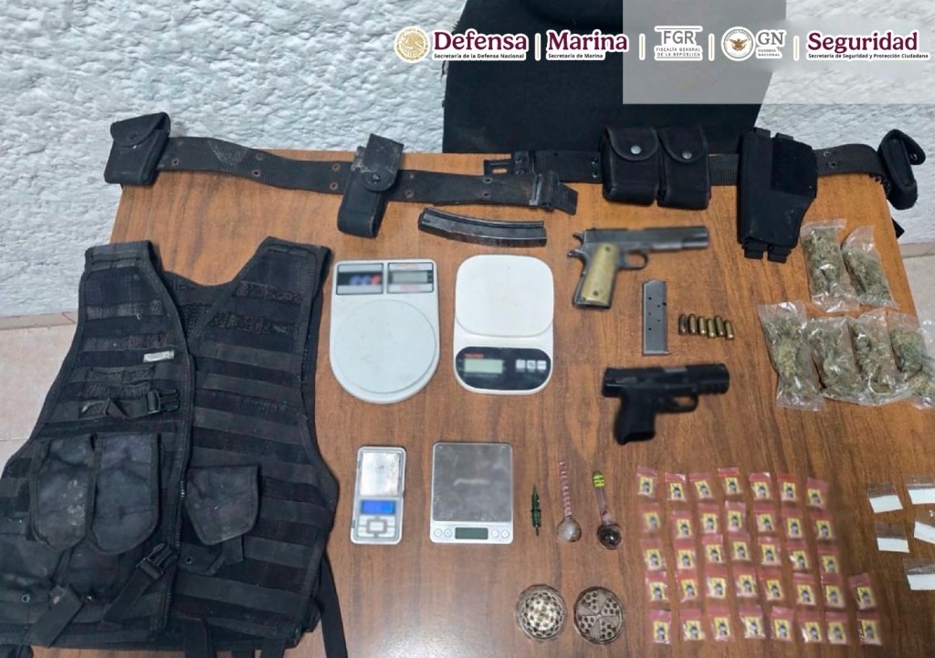 Mediante un despliegue coordinado, se ejecutó la orden de cateo en un domicilio ubicado en la colonia Gobernadores, donde se detuvo a dos hombres vinculados con una célula delictiva generadora de violencia en la capital del estado, además, se aseguraron seis bolsas con marihuana, 37 dosis cristal, cinco de cocaína, dos armas de fuego cortas, equipo táctico, básculas grameras y una motocicleta con reporte de robo.