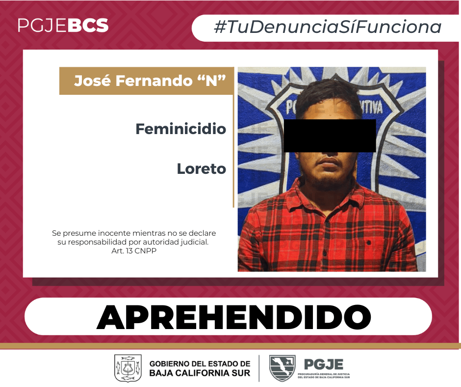 Derivado de labores de investigación y seguimiento ministerial, agentes de la Subprocuraduría de Atención a Delitos de Alto Impacto (SADAI) de la Procuraduría General de Justicia del Estado (PGJE) de Baja California Sur, cumplimentaron el 5 de noviembre una orden de aprehensión por el delito de feminicidio en contra de José Fernando “N”, de 23 años de edad.