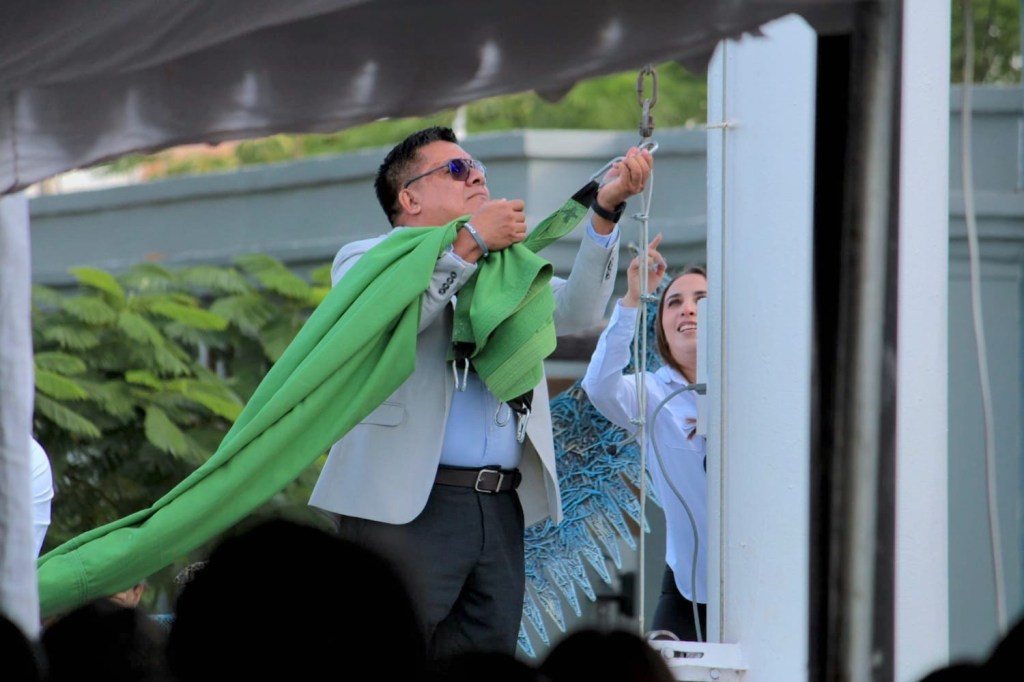 Los Cabos, Baja California Sur.– En representación del presidente municipal Christian Agúndez Gómez, el secretario general Alberto Rentería Santana encabezó este jueves 20 de noviembre el izamiento de bandera y la ceremonia cívica por el 115° Aniversario de la Revolución Mexicana, realizada en la explanada de la plaza pública José Antonio Mijares, con la participación de autoridades municipales, representantes de fuerzas armadas y estudiantes de distintos niveles educativos.
