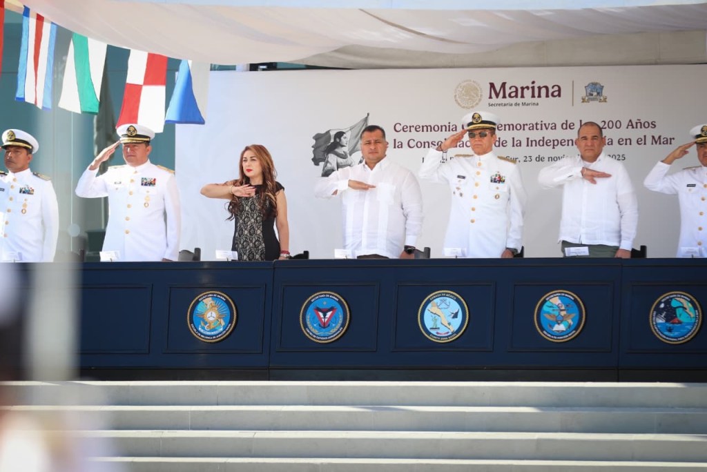La Paz, Baja California Sur, a 23 de noviembre de 2025.- El secretario General de Gobierno, José Saúl González Núñez, acudió en representación del gobernador Víctor Manuel Castro Cosío al acto conmemorativo por los 200 años de la Consolidación de la Independencia en el Mar, realizado junto al comandante de la Cuarta Zona Naval, Vicealmirante José Chapa Téllez, así como autoridades civiles y militares.