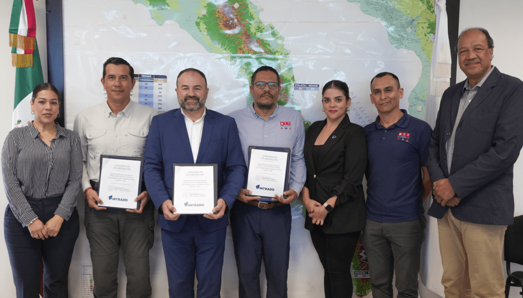 Durante la firma del convenio estuvieron presentes el gerente de Desarrollo de Negocios de Intrado, Alfonso Monreal; la subsecretaria de Seguridad Pública, Gabriela Cisneros Ruiz; y el titular de los centros C4 en el estado, Bruno Cantarell Maytorena.
