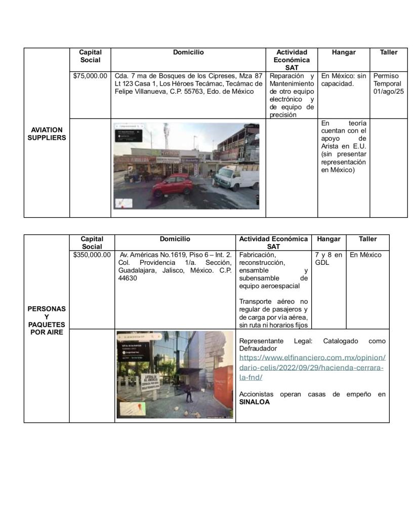 Empresas de papel, porque presentan capitalización mínima de constitución y a las que se les adjudican ciento de millones de pesos o dólares. Empresas con domicilios en negocios misceláneos como fruterías, tortillerías, funerarias, baños públicos, terrenos baldíos, callejones y hasta hoteles. Empresas que no cuentan con Hangar, o Taller.