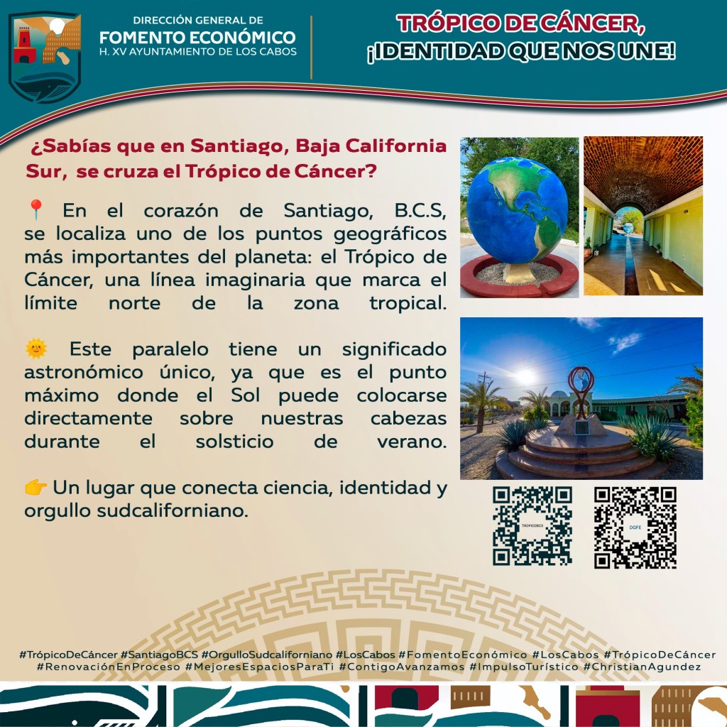 Los Cabos, Baja California Sur, a domingo 04 de enero de 2026.– La XV Administración de Los Cabos, a través de la Dirección General de Fomento Económico, a cargo de Abril Urueta Martínez, hace una extensa invitación a la ciudadanía a visitar y conocer el Trópico de Cáncer, ubicado en el corazón de la delegación de Santiago, Baja California Sur, uno de los puntos geográficos más importantes del planeta al situarse aproximadamente a los 23.5° de latitud norte, marcando el límite septentrional de la zona tropical de la Tierra.