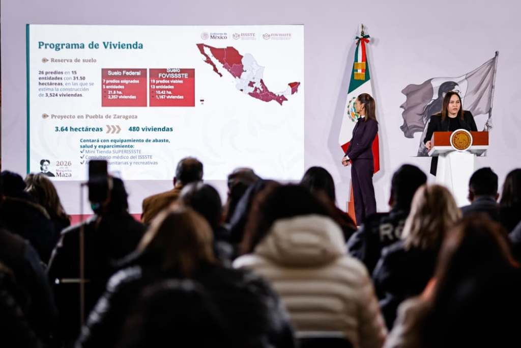 Ciudad de México, a 14 de enero de 2026.- El Instituto de Seguridad y Servicios Sociales de los Trabajadores del Estado (ISSSTE), a cargo del director general Martí Batres Guadarrama, a través de la vocal ejecutiva del Fondo de la Vivienda (FOVISSSTE), Jabnely Maldonado Meza, anunció en conferencia matutina: “La mañanera del pueblo” de la Presidenta Claudia Sheinbaum Pardo, que el fondo construirá 20 mil viviendas durante el 2026 para las y los trabajadores del Estado.