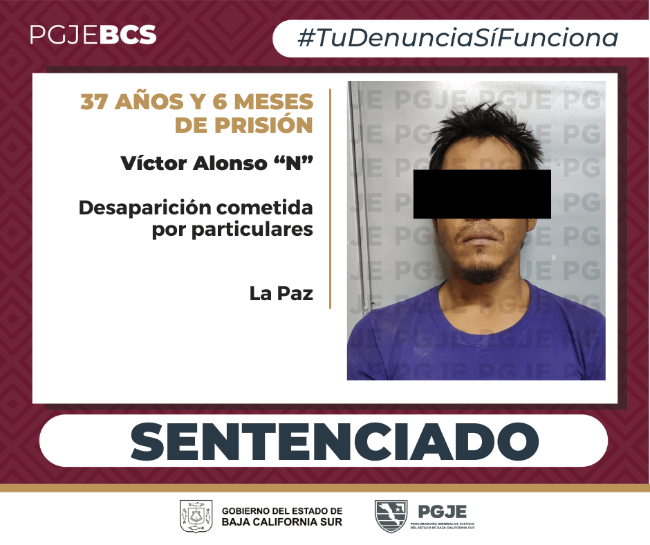 La Procuraduría General de Justicia del Estado (PGJE) de Baja California Sur logró probar la responsabilidad de Víctor Alfonso “N”, de 33 años de edad, en el delito de desaparición cometida por particulares, quien fue sentenciado a 37 años y 6 meses de prisión.