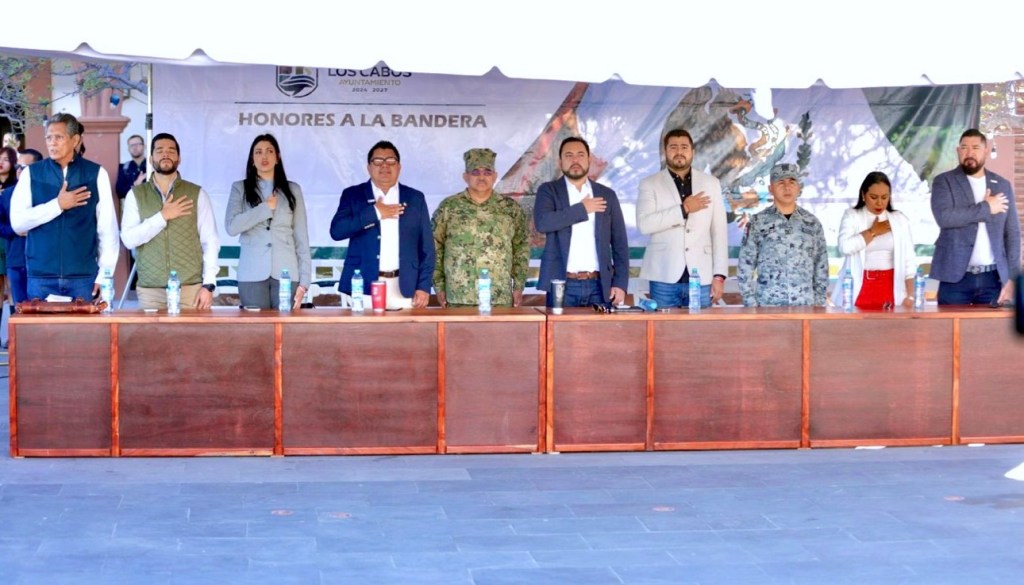 Los Cabos, Baja California Sur, a 16 de febrero de 2026.– El XV Ayuntamiento de Los Cabos llevó a cabo este lunes 16 de febrero la ceremonia de honores a la bandera, encabezada por el presidente municipal Christian Agúndez Gómez; durante su mensaje, el alcalde informó sobre diversas gestiones que se impulsan para fortalecer la seguridad y la cooperación interinstitucional en beneficio de las familias cabeñas.
