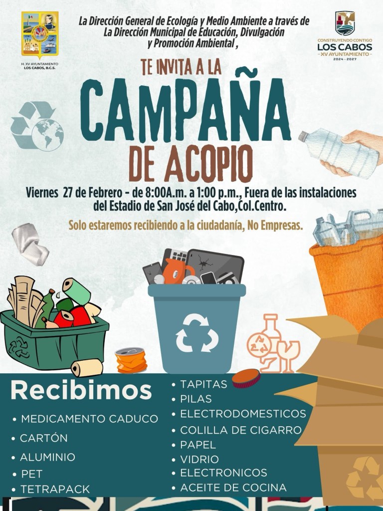 Los Cabos, Baja California Sur, a 21 de febrero de 2026.– Con el objetivo de fortalecer la cultura ambiental y reducir el impacto de los residuos en el entorno, el XV Ayuntamiento de Los Cabos, a través de la Dirección General de Ecología y Medio Ambiente y de la Dirección Municipal de Educación, Divulgación y Promoción Ambiental, puso en marcha la Campaña de Acopio de Residuos dirigida a la ciudadanía.