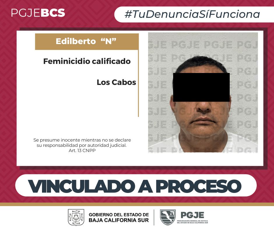 Como resultado de una investigación exhaustiva basada en protocolos científicos y con una estricta perspectiva de género, la Procuraduría General de Justicia del Estado (PGJE) de Baja California Sur logró que un Juez de Control dictara auto de vinculación a proceso y la medida cautelar de prisión preventiva oficiosa en contra de Edilberto “N”, por su probable responsabilidad en el delito de feminicidio agravado.