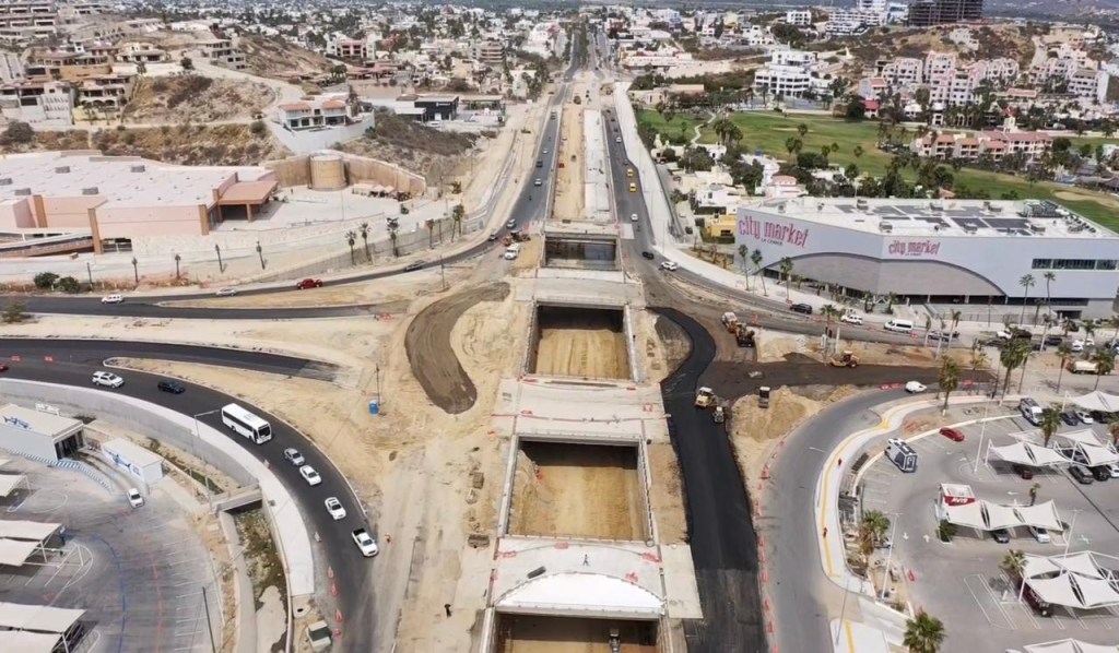Actualmente, los trabajos se concentran en la construcción del paso deprimido, que contará con cuatro carriles, dos en sentido Cabo San Lucas-San José del Cabo y dos en sentido contrario, además de vialidades laterales, puentes de retorno y accesos que mejorarán la conexión hacia la zona hotelera y el aeropuerto.