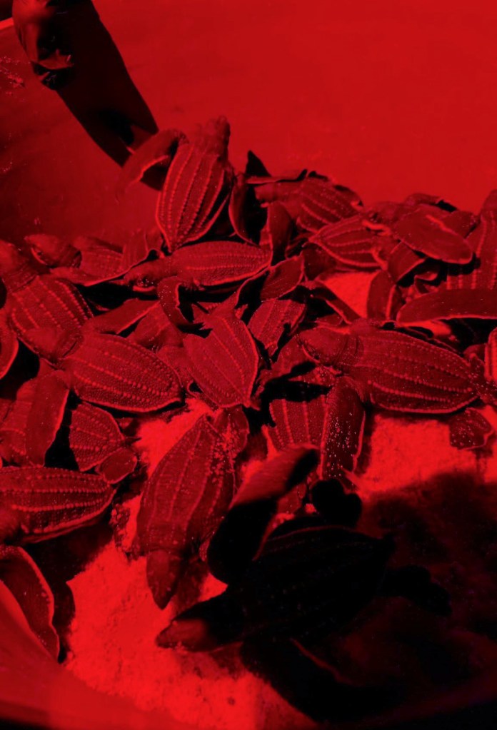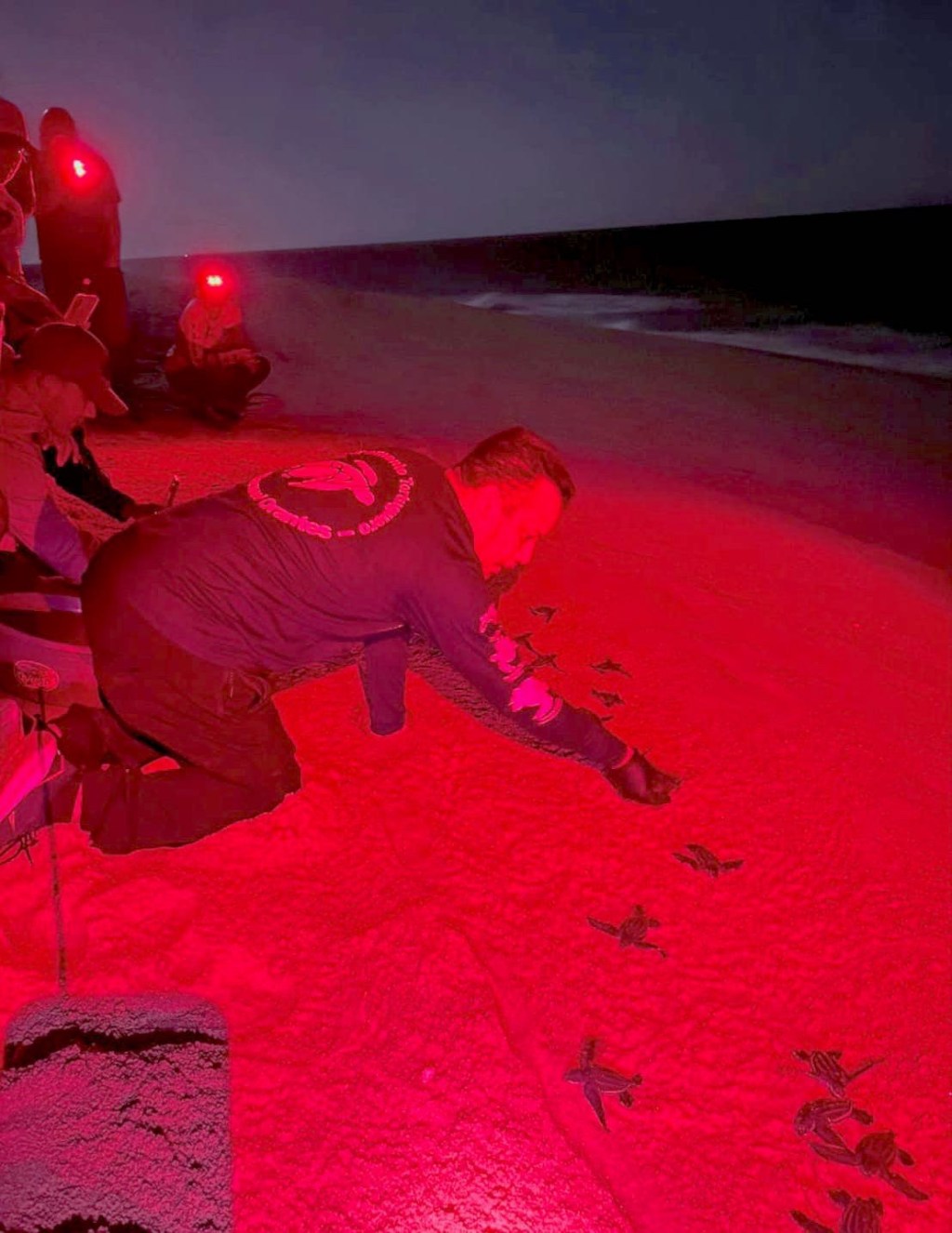 Como parte del protocolo, se empleó luz roja durante la liberación, ya que esta tiene una longitud de onda larga que las tortugas marinas apenas perciben, evitando desorientarlas. A diferencia de la luz blanca o azul, la luz roja no interfiere con su instinto natural de dirigirse hacia el mar, lo que incrementa sus posibilidades de supervivencia.