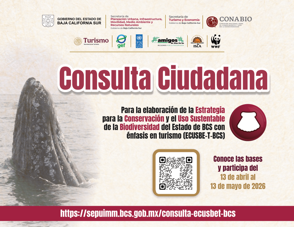 A través de la Secretaría de Planeación Urbana, Infraestructura, Movilidad, Medio Ambiente y Recursos Naturales (SEPUIMM) y la Secretaría de Turismo y Economía (SETUE), se impulsa la participación de la sociedad civil, la academia y los sectores productivos en la elaboración del instrumento ECUSBE-T-BCS, orientado al uso sustentable de la biodiversidad con enfoque turístico.