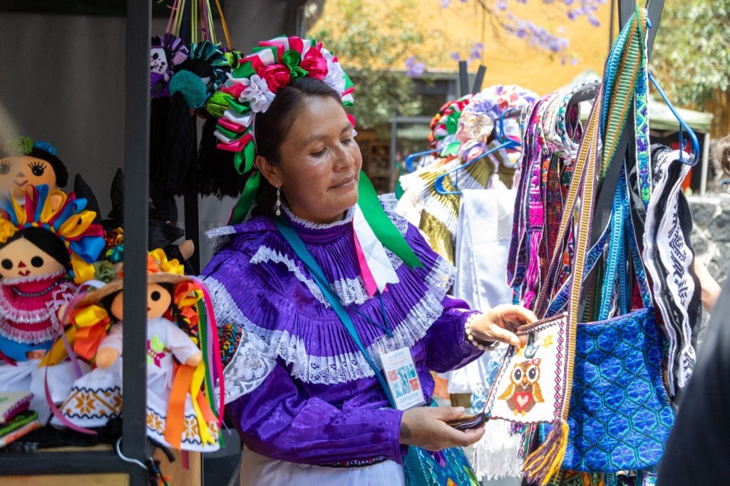 La Plaza Jacarandas reúne arte utilitario de maestras artesanas con muñecas lele, barro, textiles bordados hilvanados, muñecas tradicionales, palma, telar de cintura, sarapes, entre otras artesanías.
